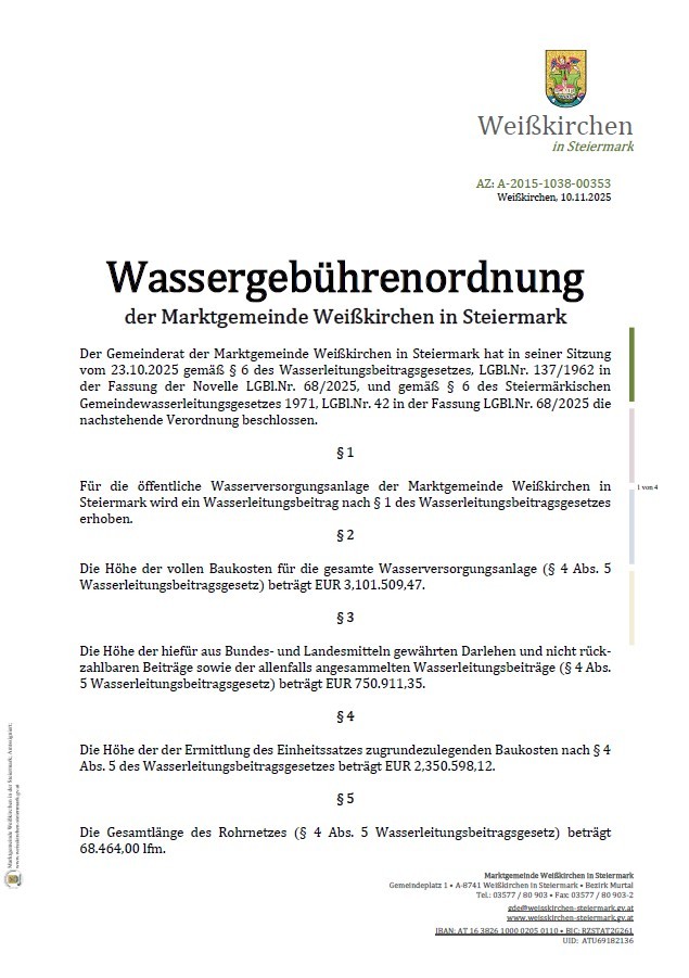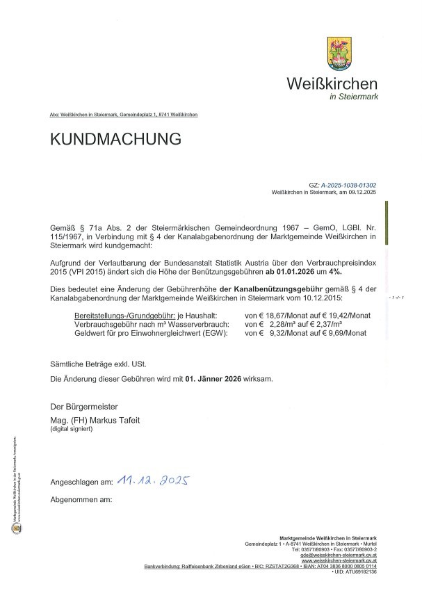 Dies bedeutet eine Änderung der Gebührenhöhe der Kanalbenützungsgebühr gemäß § 4 der Kanalabgabenordnung der Marktgemeinde Weißkirchen in Steiermark vom 10.12.2015: