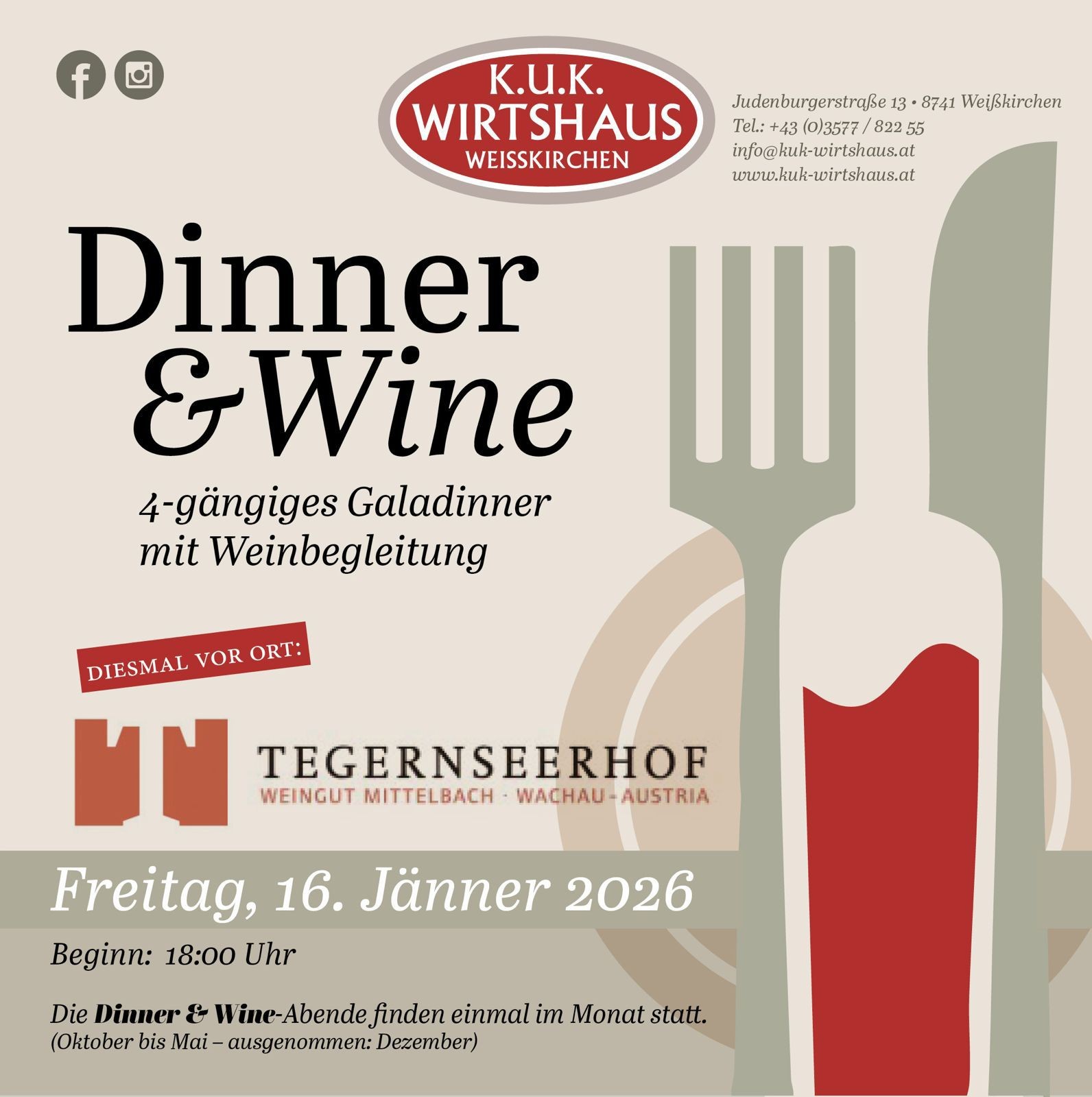 Dinner & Wine - 4-gängiges Galadinner mit Weinbegleitung - K.U.K. WIRTSHAUS WEISSKIRCHEN