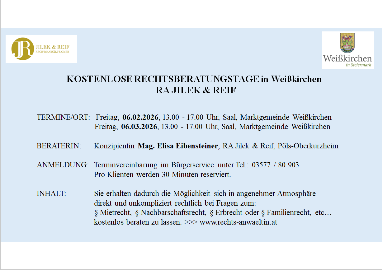 Kostenlose Rechtsberatungstage in Weißkirchen - RA Jilek & Reif