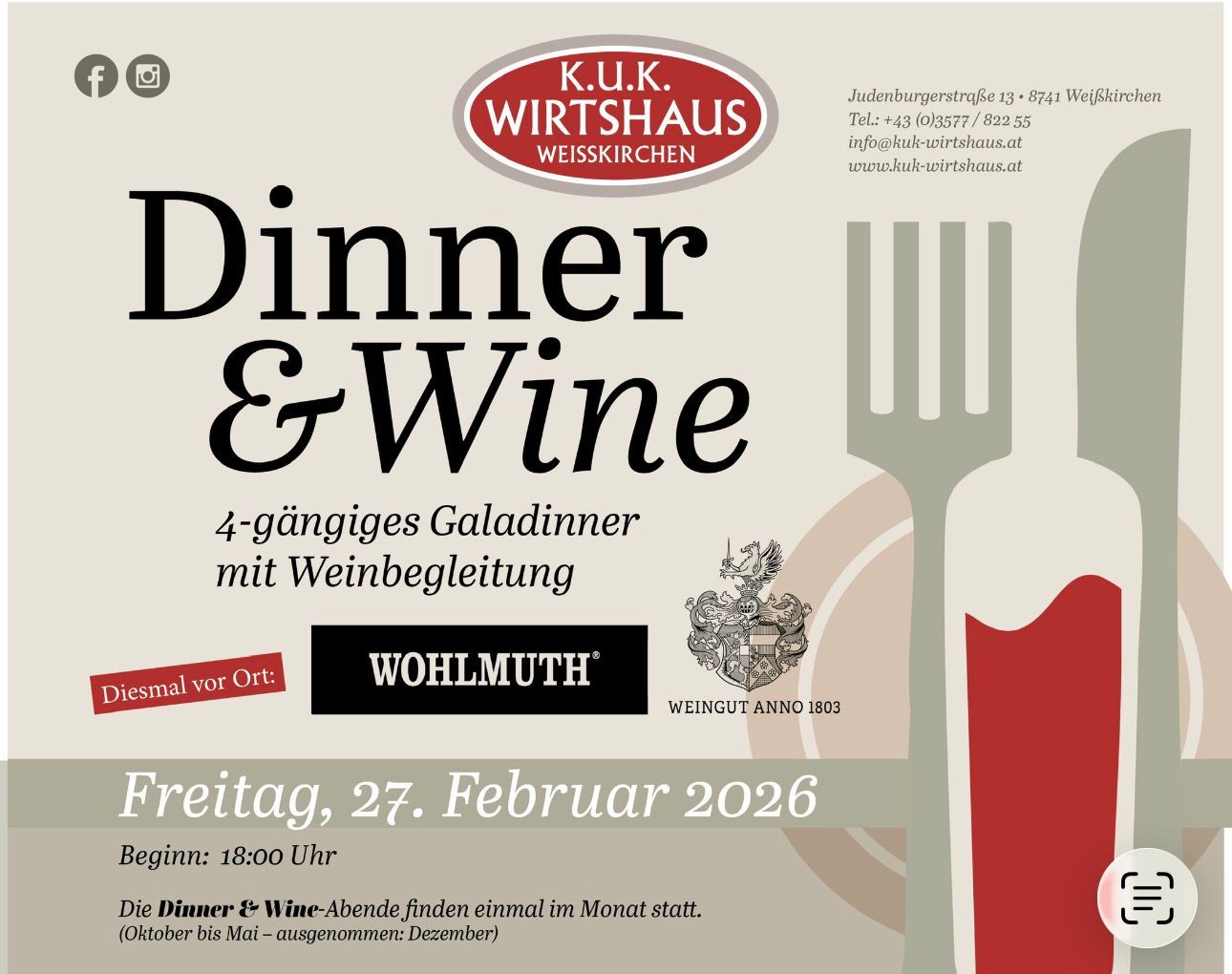 Dinner & Wine - 4-gängiges Galadinner mit Weinbegleitung - K.U.K. WIRTSHAUS Weißkirchen