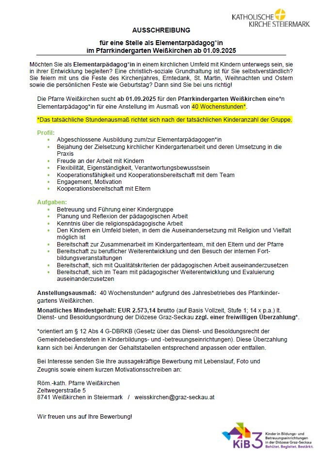 Die Pfarre Weißkirchen sucht ab 01.09.2025 für den Pfarrkindergarten Weißkirchen eine*n Elementarpädagog*in für eine Anstellung im Ausmaß von 40 Wochenstunden*.