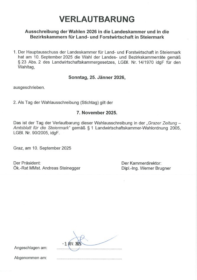 Verlautbarung Ausschreibung der Wahlen 2026 in die Landeskammer und in die Bezirkskammer für Land- und Forstwirtschaft in Steiermark