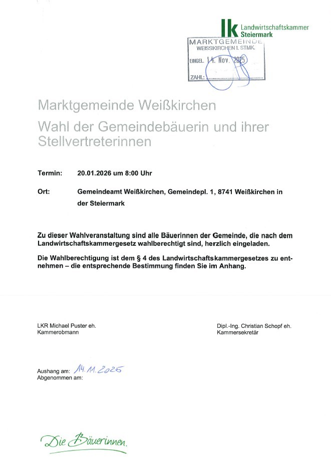 20.01.2026, um 8:00 Uhr, Gemeindeamt Weißkirchen, Gemeindeplatz 1, 8741 Weißkirchen in Steiermark