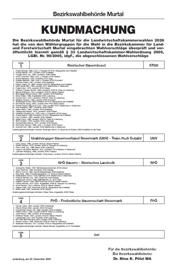 Die Bezirkswahlbehörde Murtal für die Landwirtschaftskammerwahlen 2026 hat die von den Wählergruppen für die Wahl in die Bezirkskammer für Land und