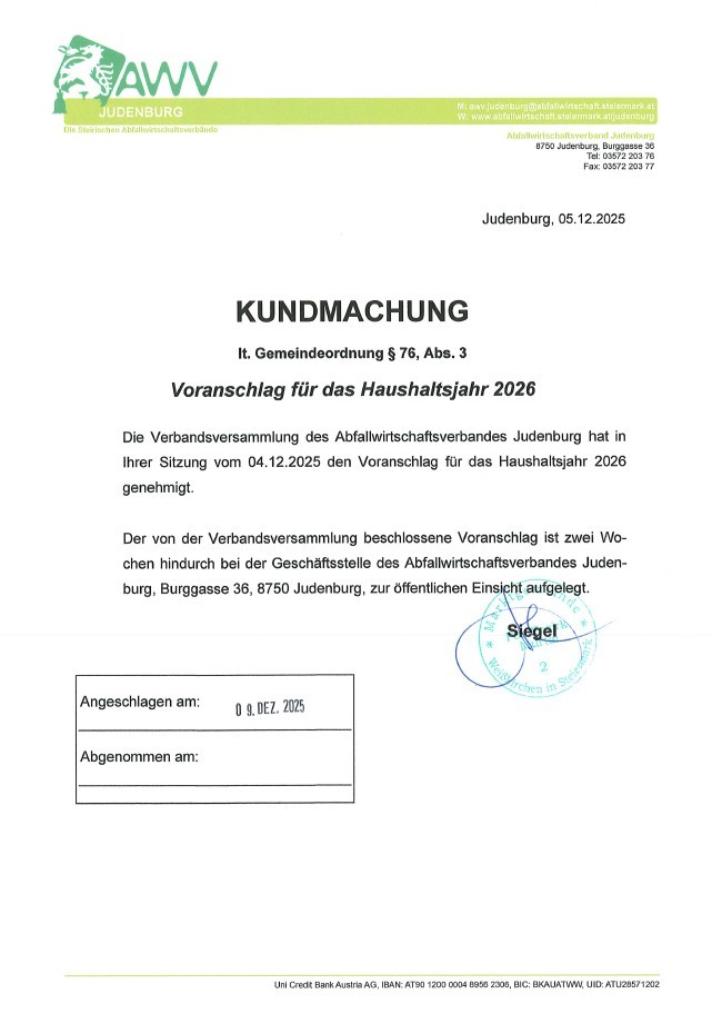 Sie befinden sich hier 〉 Kundmachung Voranschlag 2026