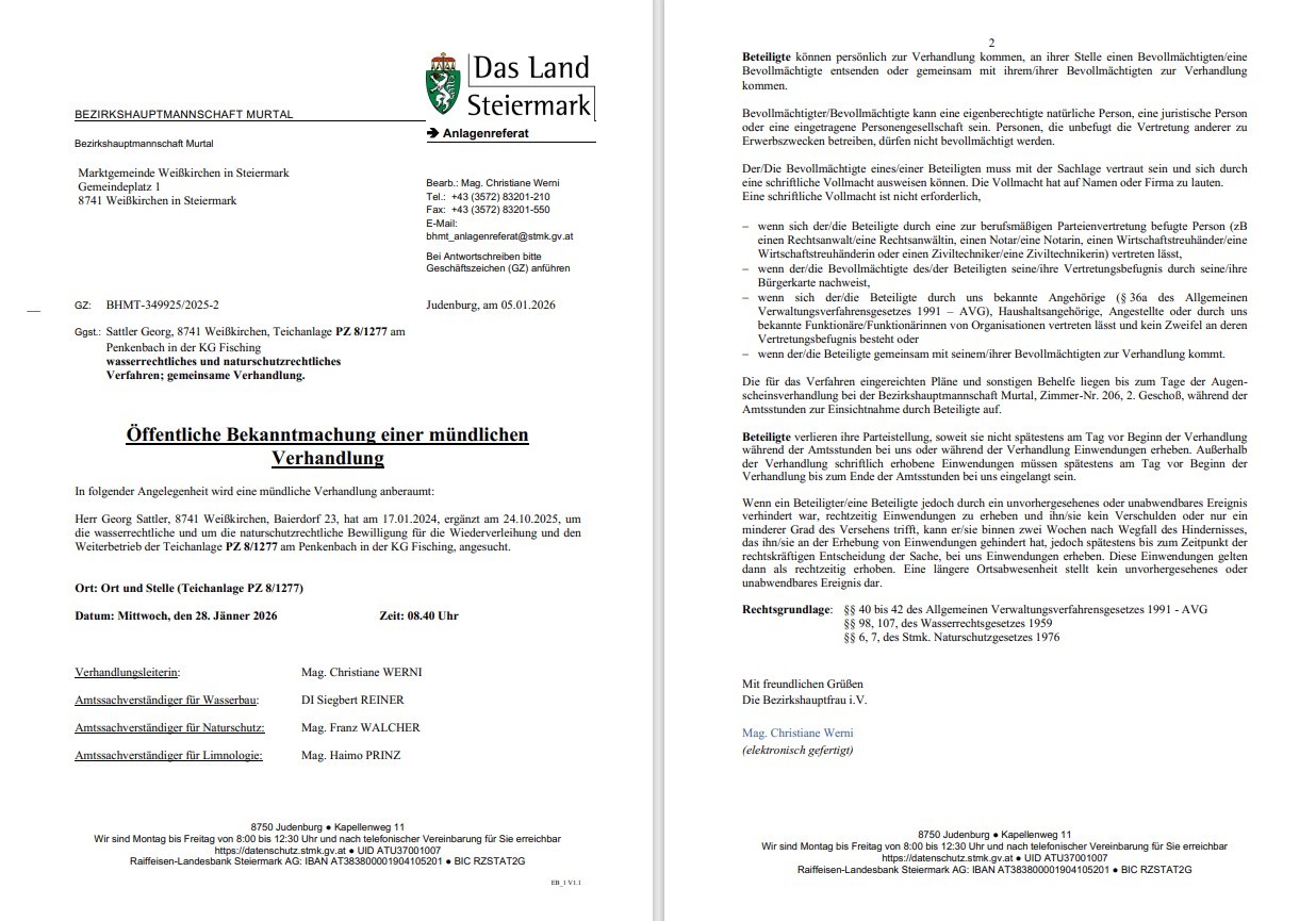 Herr Georg Sattler, 8741 Weißkirchen, Baierdorf 23, hat am 17.01.2024, ergänzt am 24.10.2025, um die wasserrechtliche und um die naturschutzrechtliche Bewilligung für die Wiederverleihung und den Weiterbetrieb der Teichanlage PZ 8/1277 am Penkenbach in der KG Fisching, angesucht.