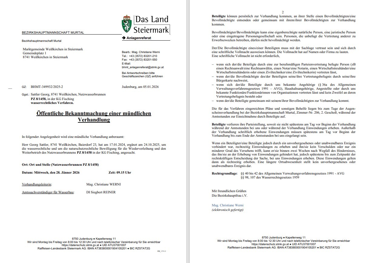 Herr Georg Sattler, 8741 Weißkirchen, Baierdorf 23, hat am 17.01.2024, ergänzt am 24.10.2025, um die wasserrechtliche und um die naturschutzrechtliche Bewilligung für die Wiederverleihung und den Weiterbetrieb des Nutzwasserbrunnens PZ 8/1458 in der KG Fisching, angesucht.