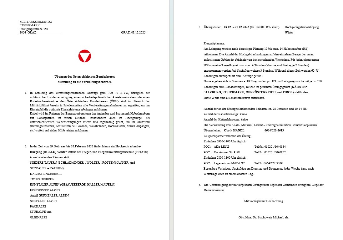 Das Militärkommando STEIERMARK informiert in der Beilage (Verlautbarungsblatt I Nr. 52/2007) über die Durchführung des Hochgebirgslandelehrganges „WINTER 2026“ der Flieger- und Fliegerabwehrtruppenschule.