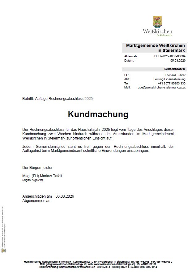 Der Rechnungsabschluss für das Haushaltsjahr 2025 liegt vom Tage des Anschlages dieser Kundmachung zwei Wochen hindurch während der Amtsstunden im Marktgemeindeamt Weißkirchen in Steiermark zur öffentlichen Einsicht auf.