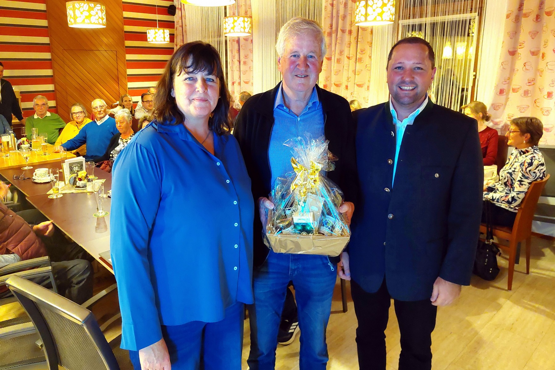 Als Dankeschön und Zeichen der Wertschätzung überreichte Bgm. Markus Tafeit (rechts) Gerhard Freigaßner ein kleines Präsent, links Gastwirtin Rosi Fellisch.