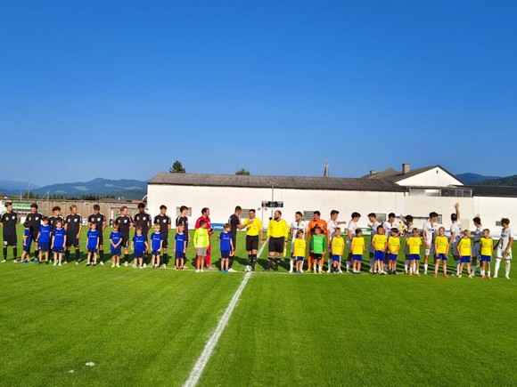 Begleitet von kräftigem Applaus betraten die Spieler des FC Raiffeisen Weißkirchen und des TSV Raiffeisen Neumarkt den Platz – an der Hand der Kinder aus der FC Weißkirchen Fußballjugend. Für die Nachwuchskicker war es ein unvergessliches Erlebnis, einmal Seite an Seite mit ihren Idolen einzulaufen. Wer weiß – vielleicht stehen einige von ihnen in ein paar Jahren selbst als Spieler hier auf dem Platz.