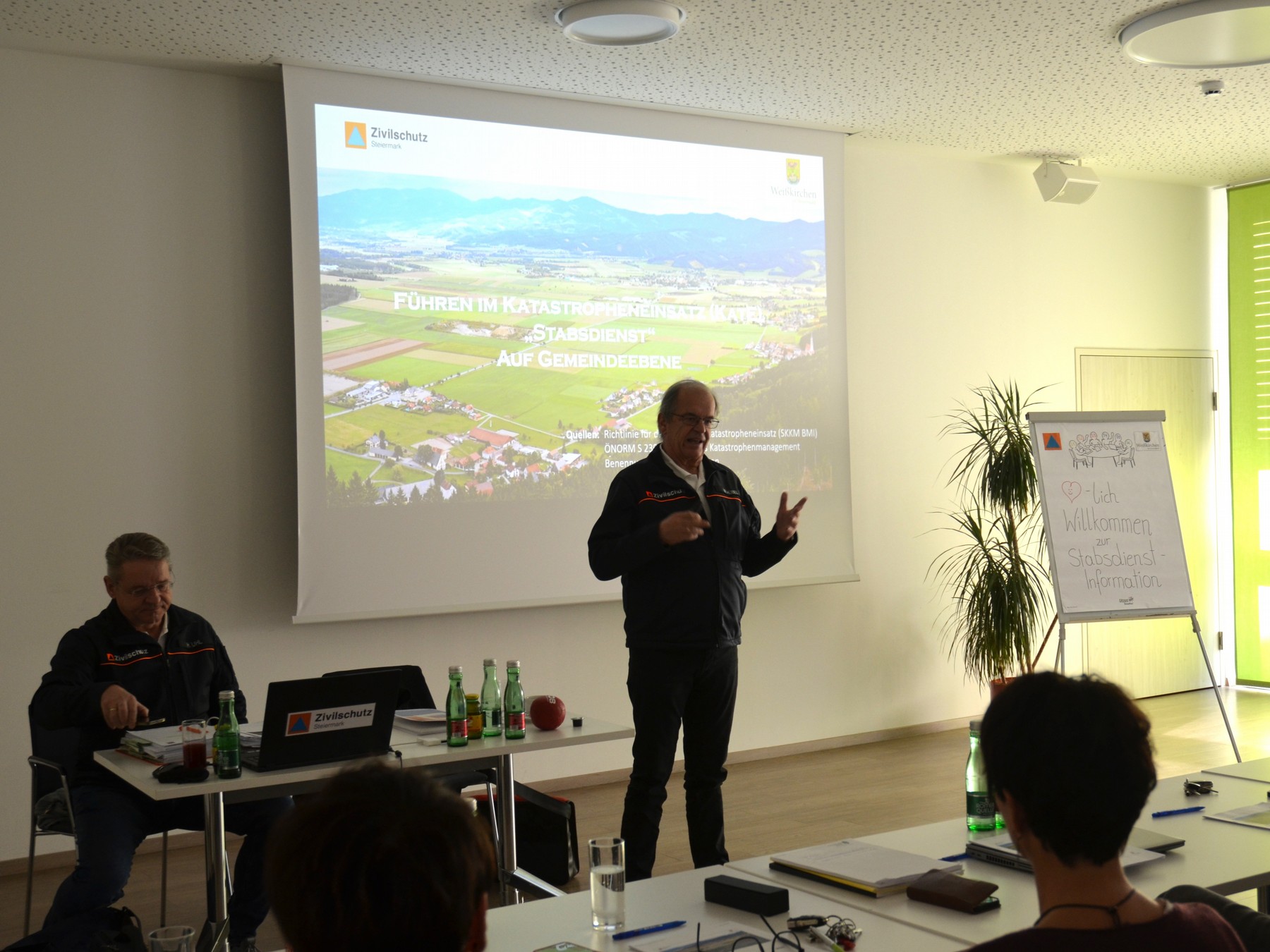 Zu Beginn führte Mag. Wolfgang Hübel in das Thema „Führen im Katastropheneinsatz – Stabsdienst auf Gemeindeebene“ ein und erläuterte die Grundlagen einer strukturierten Einsatzführung. Im Anschluss wurde das frisch erworbene Wissen im Rahmen eines Planspiels unmittelbar erprobt. Die Teilnehmer mussten dabei ein fiktives Katastrophenszenario bewältigen – eine Übung, die sich als äußerst praxisnah und lehrreich erwies.