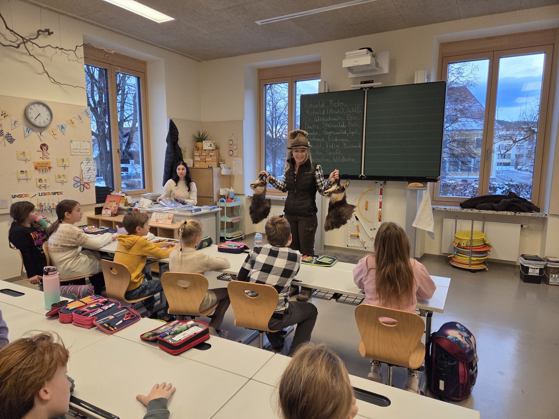 Zu Beginn wurde gemeinsam erarbeitet, welche Wildtiere den Schülerinnen und Schülern bekannt sind. Anschließend erklärten die Jägerinnen die vielfältigen und unverzichtbaren Aufgaben der Jagd. Pro Klasse durfte ein Kind in die typische Ausrüstung eines Jägers schlüpfen – mit Jägerhut, Wetterfleck, Fernglas und weiteren Utensilien.