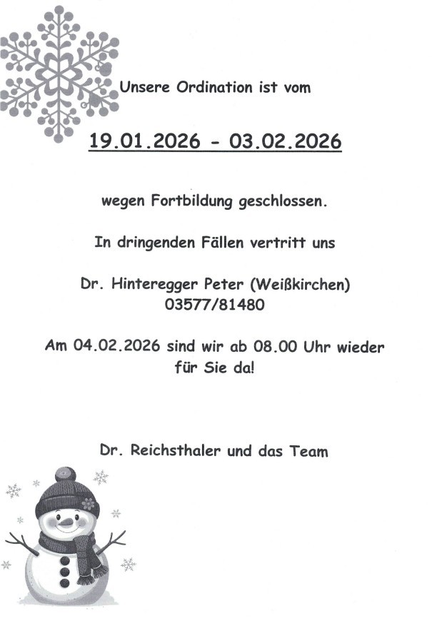 In dringenden Fällen vertritt uns Dr. Hinteregger Peter (Weißkirchen) 03577/81480.