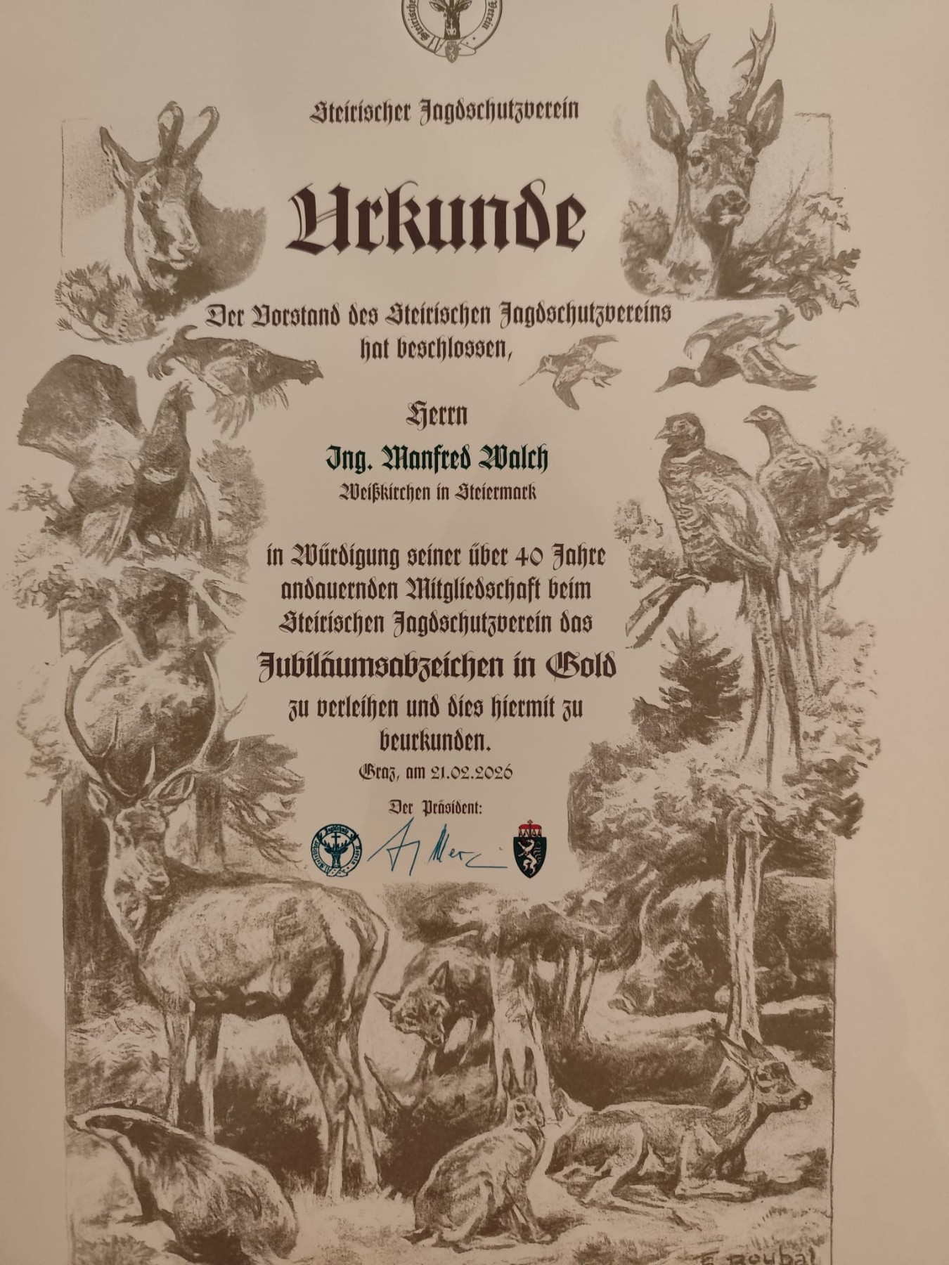- Die jahrzehntelange Verbundenheit zur Jagd, zur Gemeinschaft und zu unseren weidmännischen Werten ist nicht selbstverständlich und verdient höchste Anerkennung.