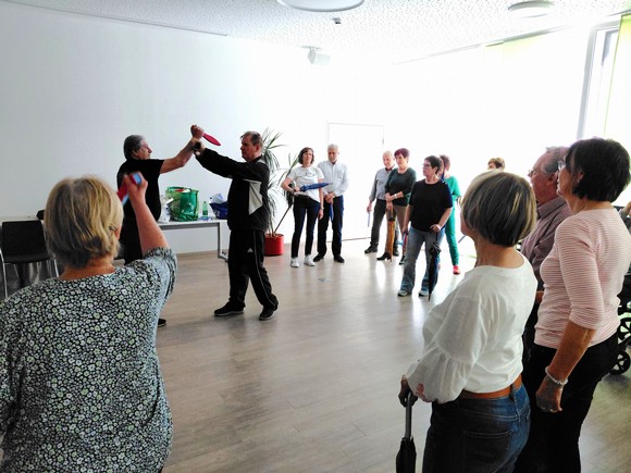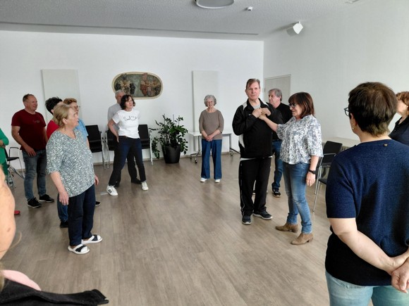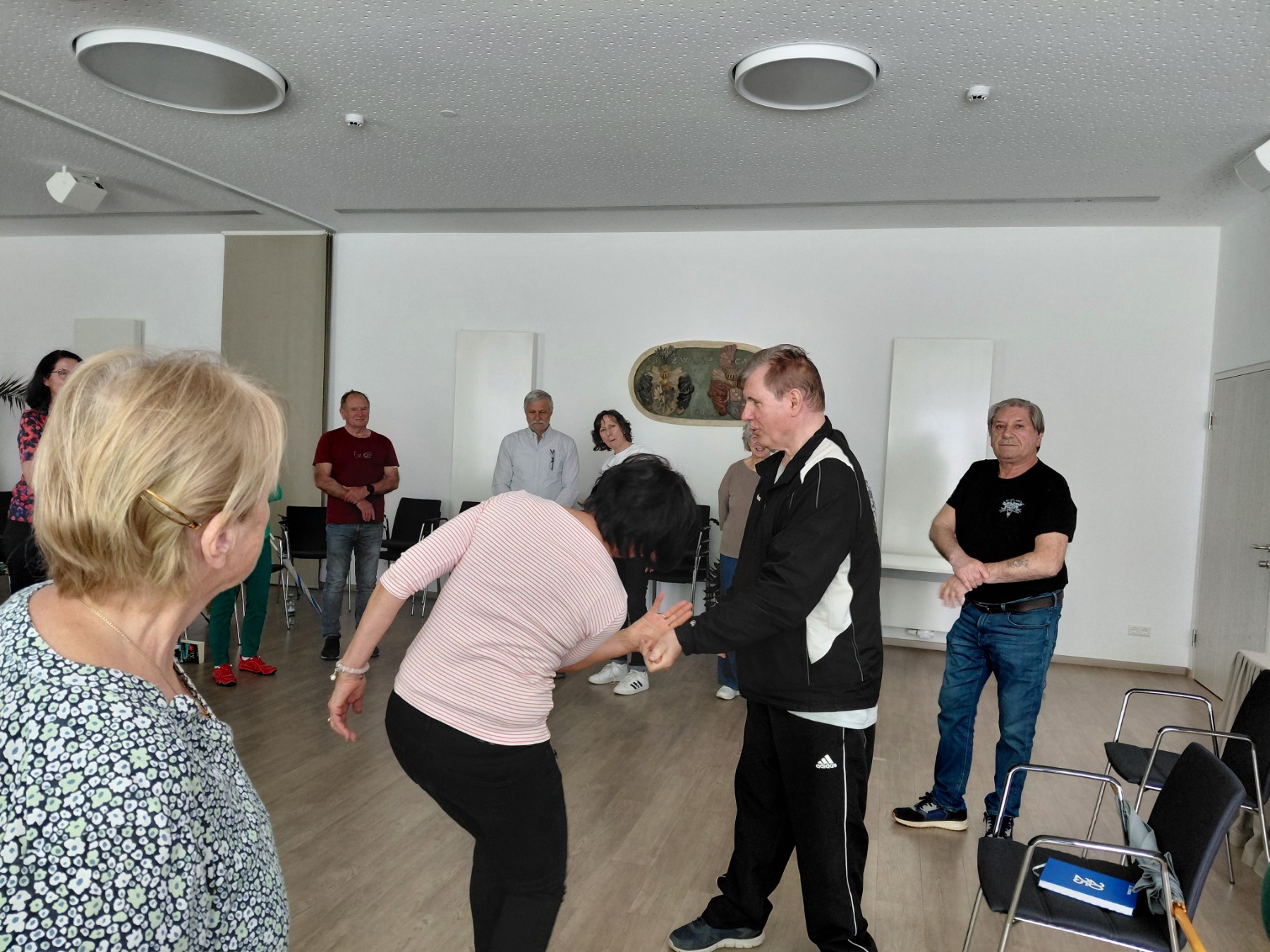 stärkste Männer in die Bodenlage zwingt. Abwehren gegen Körperangriffe und Würgeattacken sowie Schläge wurden ebenso eifrig geübt. Ein Schwergewicht waren jedoch aus aktuellen Anlässen die Messerabwehren – mit bloßen Händen und vor allem mit Alltagsgegenständen wie Schirm, Buch, Zeitung, bis hin zur Wasserflasche. Trotz des ernsten Themas kamen Spaß und Unterhaltung nicht zu kurz, zeigte sich Norbert Pelzl auch als guter Entertainer, was die 4 Stunden rasch vergehen hat lassen.