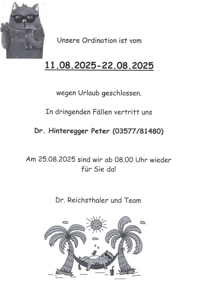 In dringenden Fällen vertritt uns Dr. Peter Hinteregger Tel.: 03577/81480.