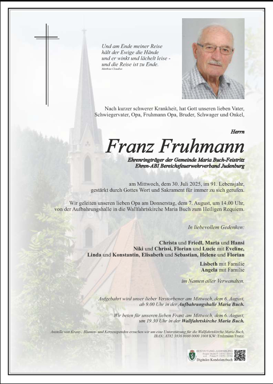 Die Begräbnisfeierlichkeiten beginnen am Donnerstag, den 7. August, um 14.00 Uhr vor der Aufbahrungshalle Maria Buch.